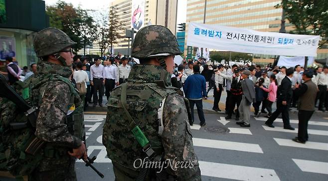 | ▲ 전작권 환수 촉구 시위와 군인들 평화와통일을여는사람들(평통사) 회원들이 '건군 제65주년 국군의 날' 기념 시가행진이 열리는 1일 오후 서울 세종로 네거리에서 '전시작전통제권 환수' 촉구 시위를 벌이고 있다. 시가행진 도중 벌어질 만일의 사태에 대비해 배치된 군인들이 시위 장면을 지켜보고 있다. |