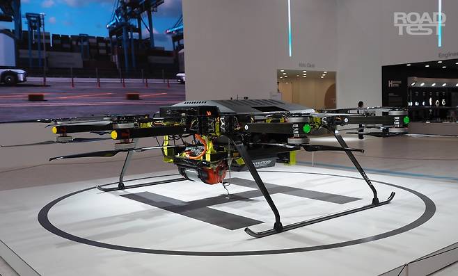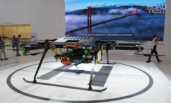 지난 5월 개최한 ‘미래항공모빌리티 테크데이 2022’에서 처음 등장했던 수소 멀티콥터 드론도 전시했다. 직경 6m, 최대 이륙 중량 700㎏를 자랑하는 드론으로, 배터리 기반의 일반적인 UAM 기체와 달리 수소연료전지 시스템과 배터리를 동시에 써 먼 거리를 효율적으로 날아갈 수 있다.