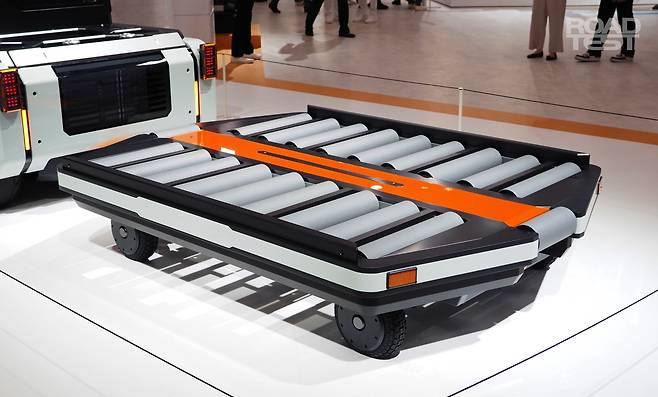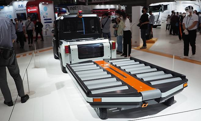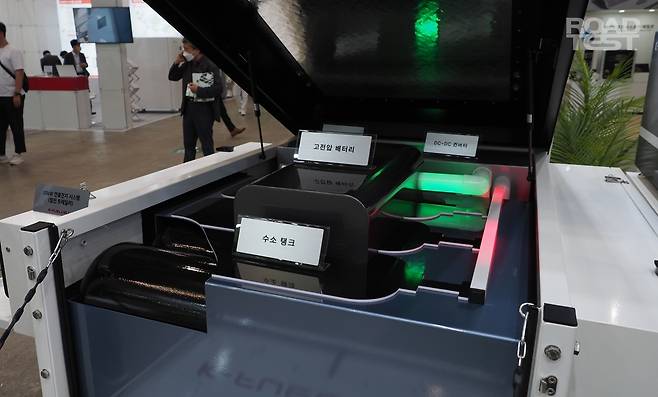 케이퓨얼셀(K-Fuel Cell)은 이동식 미니 트레일러를 선보였다. 30㎾급 수소연료전지 시스템과 냉각 모듈, DC‧DC 컨버터, DC‧AC 인버터, 고전압 배터리, 수소용기(120L), 전기차 충전기 및 콘센트를 품었다. 트레일러 적재함의 길이와 너비, 높이는 각각 2,655×1,480×1,200㎜로 아담하다.