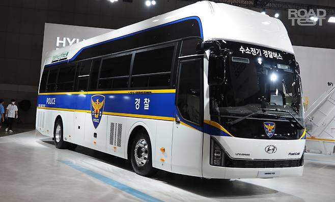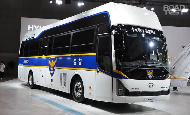 수소연료전지 경찰 버스는 유니버스를 밑바탕 삼았다. 기존 직렬 6기통 12.7L 디젤 터보 파워텍(Powertec) 엔진 대신 수소연료전지 2개로 구성한 180㎾급 수소연료전지 스택을 얹었다. 완충 시 1회 주행거리는 550㎞. 실내 후방에는 적재 공간, 버스 하부엔 4.9㎡의 화물실을 마련해 활용도를 높였다.