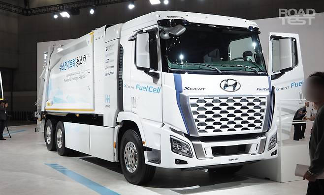 다음은 엑시언트 FCEV 기반 청소차 및 살수차. 두 개의 수소연료전지를 품은 180㎾급 수소연료전지 스택과 350㎾(약 475마력)급 전기 모터가 들어간다. 현대차가 발표한 1회 충전 주행거리는 400㎞.