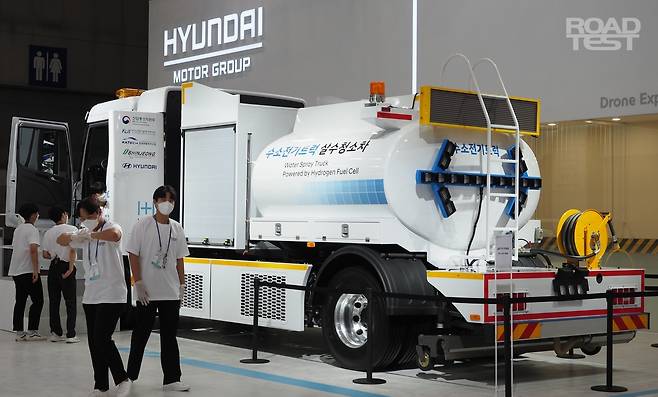 먼저 현대차그룹은 수소연료전지 경찰 버스와 청소차, 살수차 3종을 공개했다. 산업통상자원부의 ‘수소연료전기트럭 개조기술 개발 및 실증’ 연구 개발 과제를 통해 만든 작품이다. 올해 말부터 실증 운행을 실시하고, 오는 2023년부터 판매할 예정이다.
