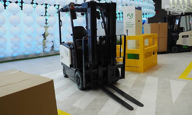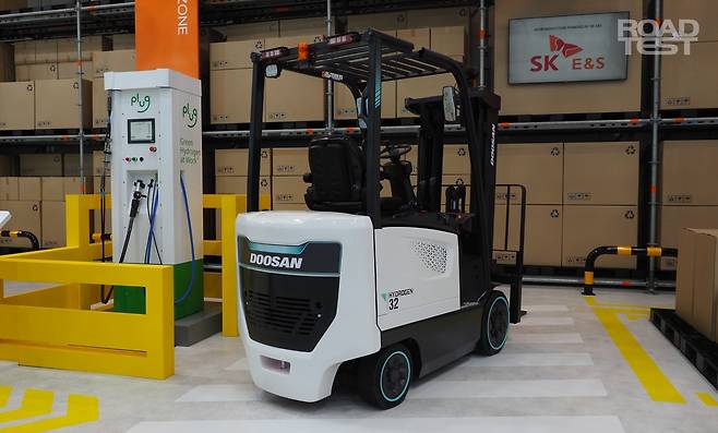 SK E&S는 물류센터 내부를 재현한 ‘수소 물류센터(H2 Warehouse)’ 부스를 마련했다. 이곳에는 두산밥캣과 함께 개발한 수소연료전지 지게차를 전시했다. 수소 탱크 용량은 0.7~3.4㎏. 최대 350bar(바)의 압력으로 3분 만에 충전할 수 있다. SK E&S가 발표한 수소연료전지 출력은 15㎾.