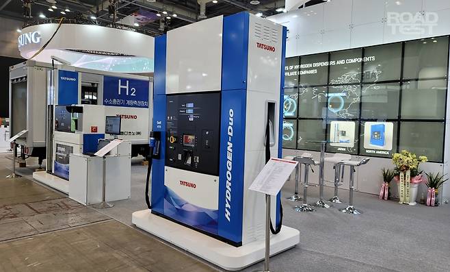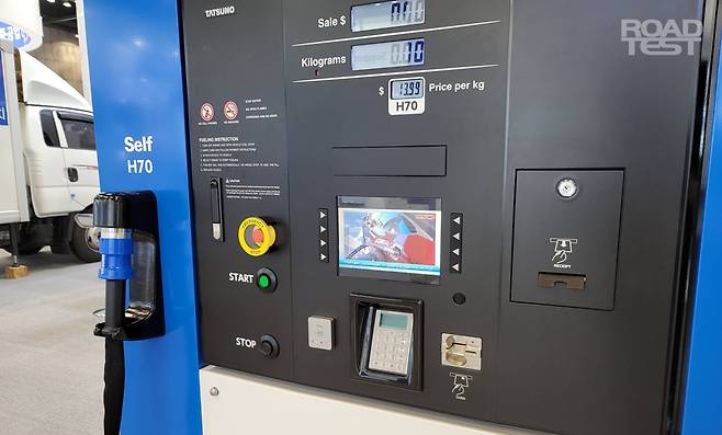한국 다쓰노가 전시한 셀프 수소 충전기도 눈길을 끈다. 주유기처럼 정전기 방지 패드와 카드 단말기, 금액 표시판을 갖춰 주유기처럼 쉽게 조작할 수 있다. 최대 충전 압력과 범위는 각각 87.5㎫, 1분당 3.6㎏이다.