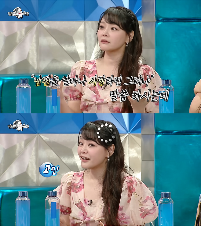 여태까지는 자기만족이라고 생각해 왔지만, 질문을 받고 나니 인정하고 싶지는 않지만 아주 조금은 차이가 있는 것 같다며 남편 손준호에 대한 남다른 애정을 드러내며 특유의 환한 웃음으로 시청자들의 미소를 자아냈습니다.