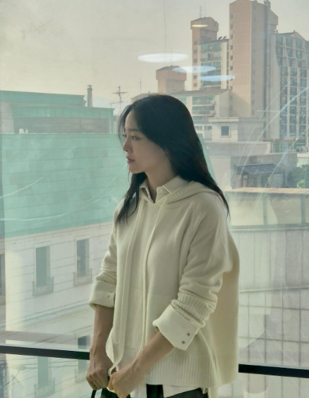 김세정은 아이보리 색상의 니트 재질의 후드티에 블라우스를 매치해 비가 내려 쌀쌀한 날씨에도 따뜻함을 유지할 수 있도록 했습니다.