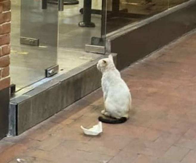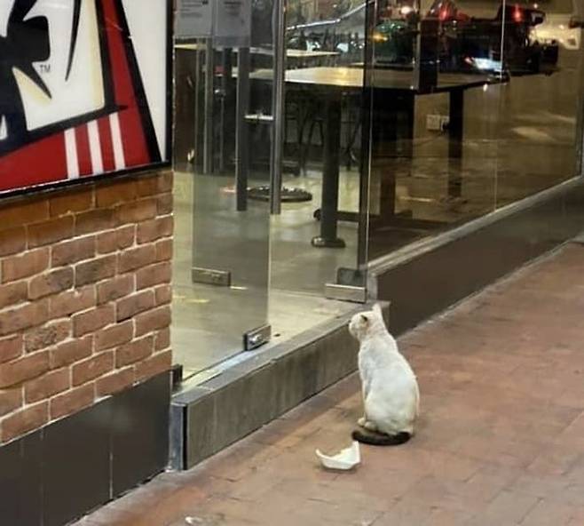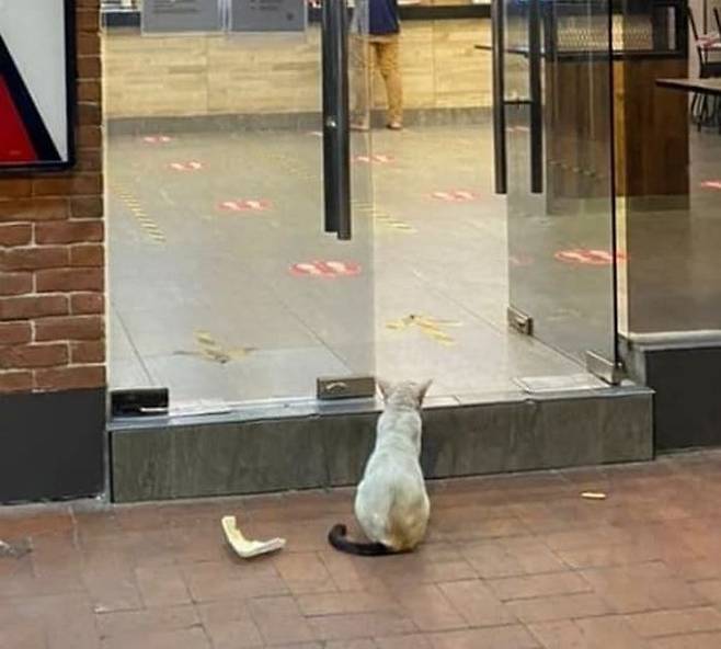 사연은 이렇습니다. SNS상에는 말레이시아에 위치한 유명 패스트푸드 매장 입구에 앉아 좀처럼 눈을 떼지 못하는 길고양이 모습이 담긴 사진이 올라왔는데요.