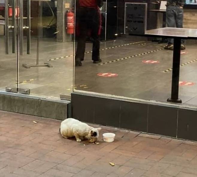 다행히도 패스트푸드 매장 매니저가 길고양이를 발견, 치킨 몇 조각을 들고 나와 챙겨줬다고 합니다.