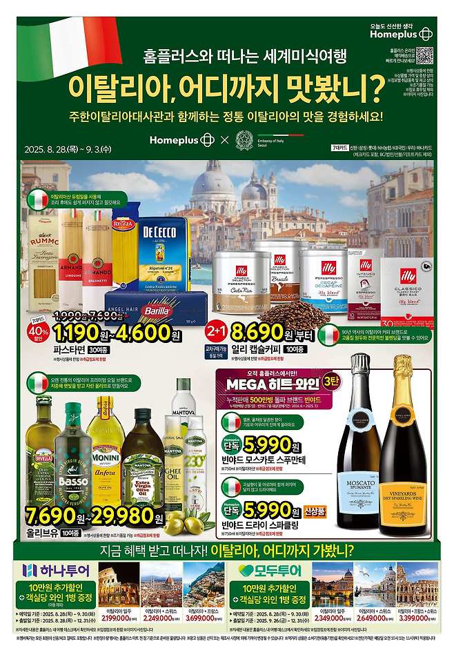 이번 홈플러스 전단은 이탈리아 식품 페어를 메인으로 하여 파스타, 올리브유, 와인 등 정통 이탈리아 식품을 대폭 할인하고, 가전제품 쿠폰할인과 신선식품 1+1 혜택까지 다양한 할인 혜택을 제공하고 있습니다.