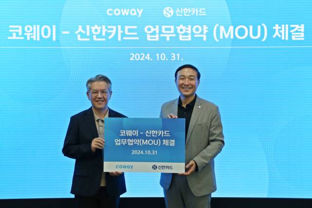 문동권(오른쪽) 신한카드 대표와 서장원 코웨이 대표가 31일 서울 중구 신한카드 본사에서 업무협약을 맺고 기념 촬영을 하고 있다.