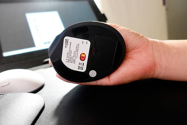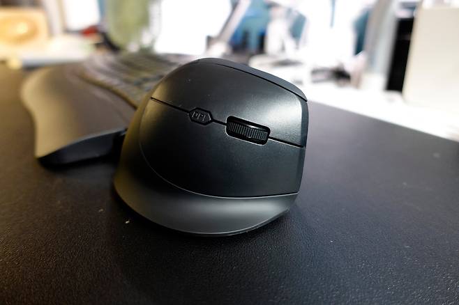 일반 마우스와 비교하면 자연스럽게 손을 올려놓은 모습 그대로 사용이 가능하도록 만들어진 버티컬 타입입니다.
