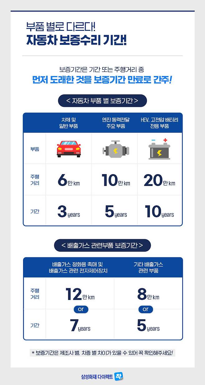 보증기간은 제조사 별, 차종 별 차이가 있기 때문에 자세한 내용은 자동차 보증서를 확인해주세요.