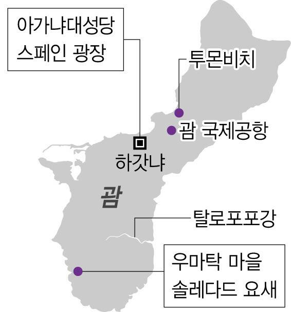 괌은 미국령이지만 태평양을 의미하는 파란색 바탕에 1948년 제정된 문장이 그려진 국기가 따로 있다. 문장은 차모로인의 용맹함과 민첩성을 상징한다. 전체 인구의 37% 이상이 차모로인인 괌의 독립성을 강조한 것이다. 크고 작은 19개 마을로 구성된 괌은 스페인 통치, 미국과 일본의 점령 등 역사의 상흔이 남아 있는 나라다. 여행객이 즐비한 투몬과 타무닝 지역보다는 수도 하갓냐(아가냐)와 인근 지역에 그 흔적이 많다.