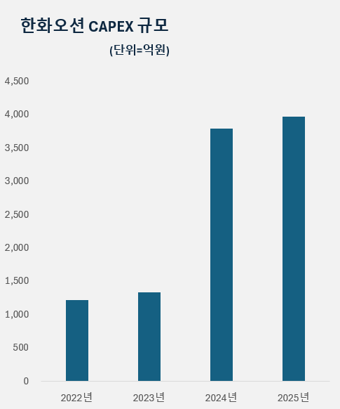 또한 2018년 적자를 기록한 경쟁사와 달리 한화오션은 영업흑자를 달성했지만 그해 CAPEX 투자액은 전년 수준에 머물렀다.