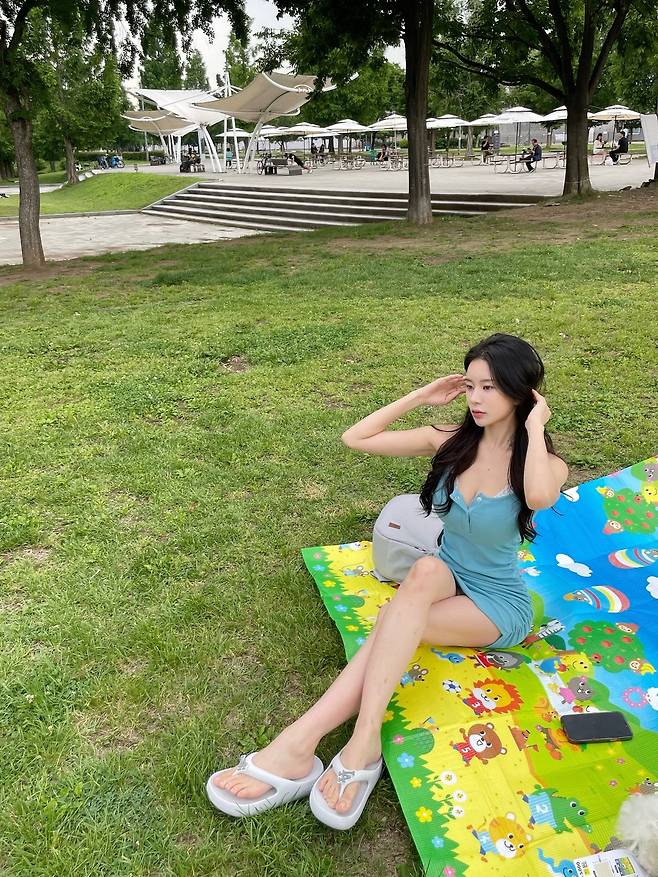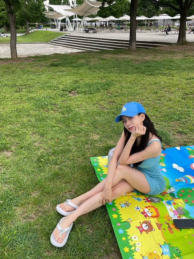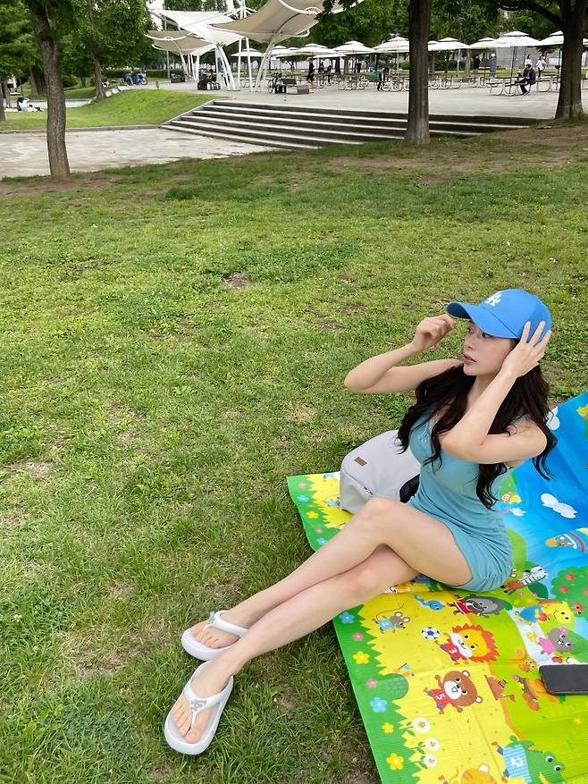 짙은 블루 컬러 원피스를 활용해 무더운 날씨 속에서도