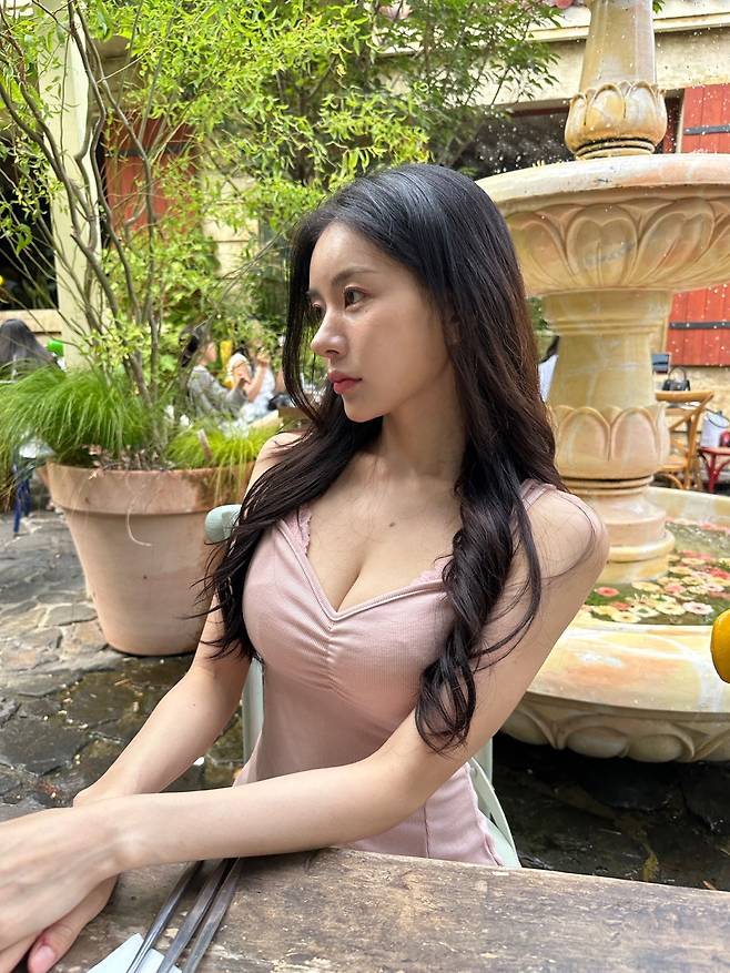 웨이브 헤어와 함께 셔링 디테일이 들어간 원피스를 매치하면