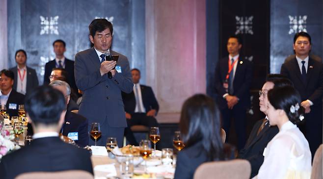 | ▲ 박재원 이집트 한인회장이 20일(현지시간) 카이로의 한 호텔에서 이재명 대통령 부부가 참석한 가운데 열린 이집트 동포·지상사 간담회에서 환영사를 하고 있다. |