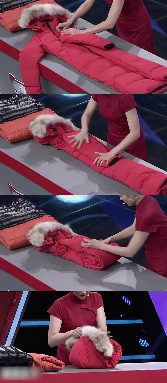 2. 세로로 길게 접은 패딩을 아래에서부터 말아서 갠다.