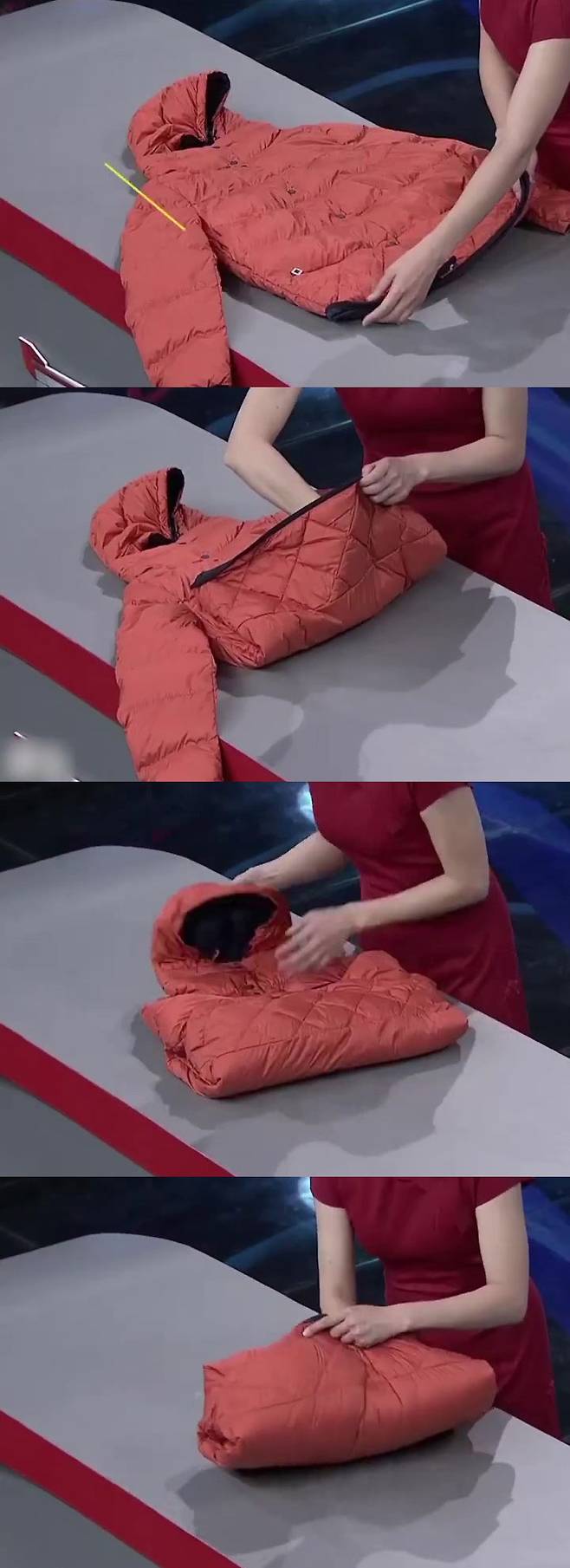 1. 지퍼를 잠근 뒤 팔 부분을 접고 몸통 부분을 세로로 길게 접는다.