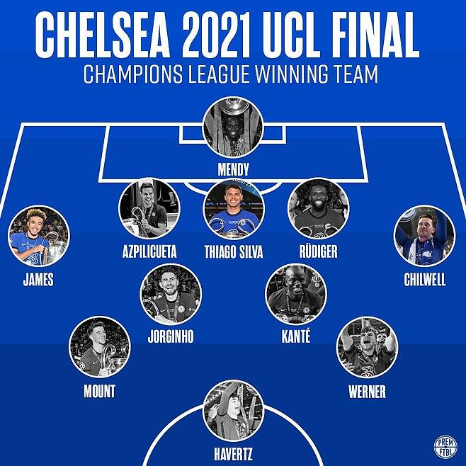 첼시의 2020/21 UCL 우승 멤버 베스트 11은 카이 하베르츠, 티모 베르너, 메이슨 마운트, 은골로 캉테, 조르지뉴, 벤 칠웰, 안토니오 뤼디거, 티아구 실바, 세자르 아스필리쿠에타, 리스 제임스, 에두아르 멘디가 구성했다.