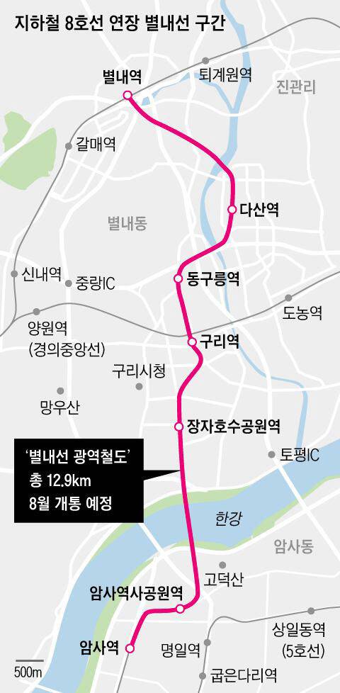 8호선 연장노선의 명칭은 남양주시 별내신도시를 딴 별내선이지만, 구리시가 가장 큰 수혜를 받고 있다는 평가다. 구리 시내에만 장자호수공원역, 구리역, 동구릉역 등 3개역이 개통했다. 구리역에서 잠실역까지 45분이던 이동시간은 18분으로 줄었다. 강남까지도 30분대로 이동할 수 있다.