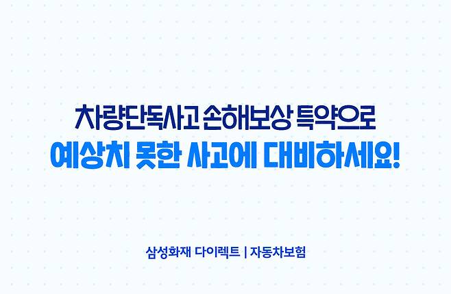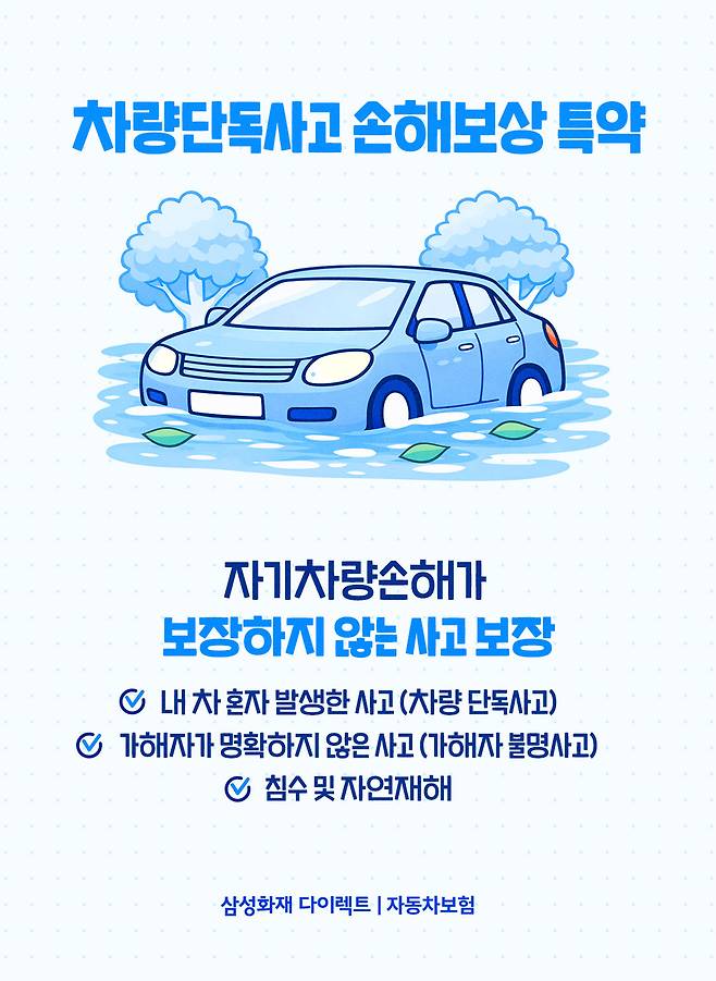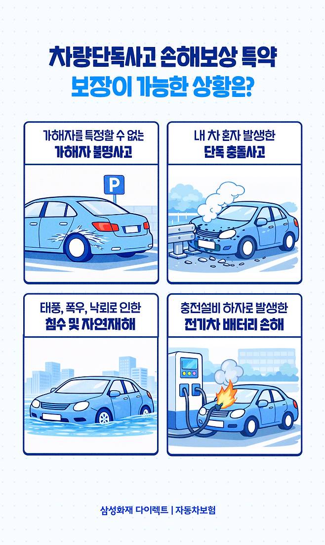 ✔ 차량단독사고 손해보상 특약: 가해자불명, 단독사고 및 자연재해 사고 보장