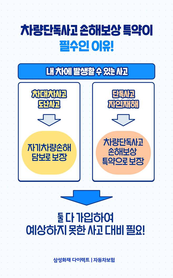 자기차량손해 담보(자차보험)만 가입하면 단독사고나 자연재해 상황에서는 보상받을 수 없기 때문에 추가적인 대비가 필요합니다.