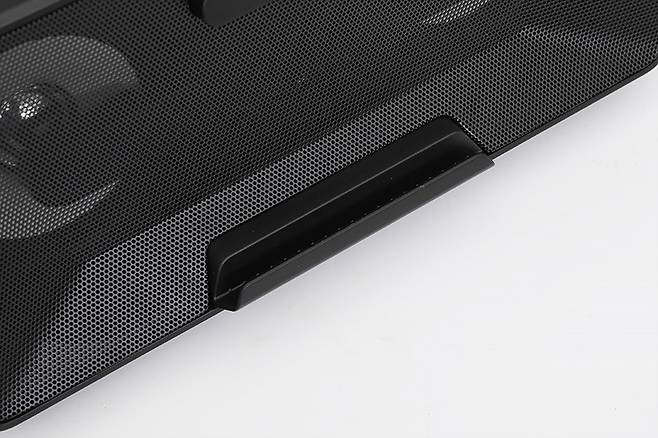 전면부의 가운데 아래쪽에는 작은 턱이 하나 있는데, 태블릿PC나 스마트폰을 걸쳐두는 거치대이다.