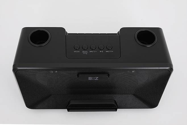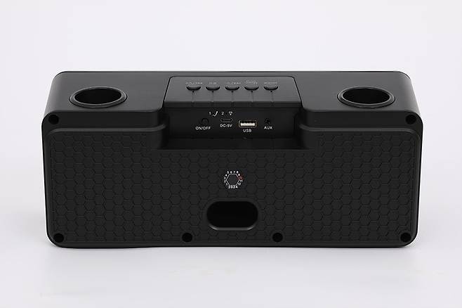 비즈 블루투스노래방 BZ-K1010C 본체 뒷면은 전체적으로 벌집 모양의 무늬가 적용되어 있으며, 가운데 아래쪽에는 저음을 강화해주면서 공기의 흐름을 조절해주는 덕트가 마련되어 있다.