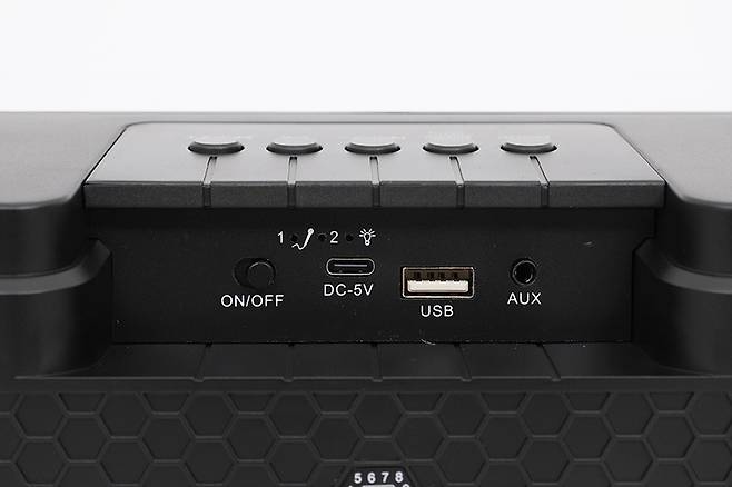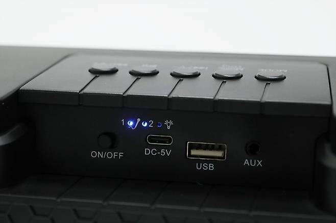 본체 뒷면을 자세히 보면 윗면 버튼 바로 아래쪽에 무언가가 많이 모여 있다. 왼쪽에서부터 전원 스위치와 충전용 USB C타입 포트, USB A타입 포트, 그리고 AUX 단자가 보인다. 입출력 단자 바로 위에는 두 개의 마이크 연결 상태 표시 LED와 충전 표시 LED가 자리 잡고 있다.