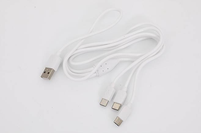 기본 제공되는 충전용 케이블은 3개의 USB C타입 커넥터를 갖추고 있는 3 in 1 케이블이기 때문에 케이블 하나로 본체와 두 개의 마이크를 동시에 충전할 수 있다.