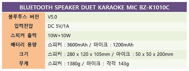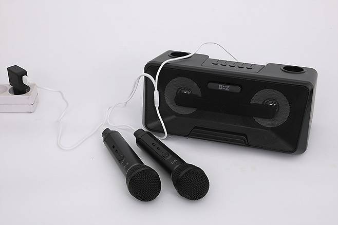 가정에서 노래방을 즐길 때에는 마이크 타입으로 된 제품을 사용하는 경우도 많지만, 공간이 조금만 넓어져도 출력이 아쉬워진다. 이런 경우에는 스피커와 마이크가 분리되어 있는 타입이 훨씬 더 높은 출력을 제공하는데, 비즈 블루투스노래방 BZ-K1010C는 20W의 출력에 충전식 배터리로 언제 어디서나 활용 가능한 제품이다.