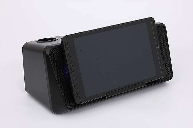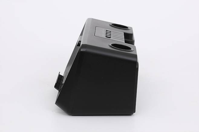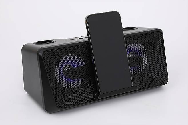 옆에서 바라보면 본체의 전면부가 살짝 기울어진 형태이기 때문에 본체를 바닥에 두고 사용해도 사운드가 위쪽으로 뻗어나갈 수 있으며, 태블릿PC나 스마트폰을 거치했을 때 보기 좋은 각도를 만들어준다.