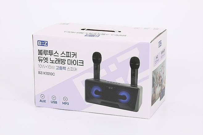 비즈 블루투스노래방 BZ-K1010C는 흰색 바탕의 박스에 담겨 있다. 박스 앞면에는 제품의 컬러 이미지가 인쇄되어 있어서 개봉 전에도 제품의 색상이나 디자인을 가늠할 수 있다.