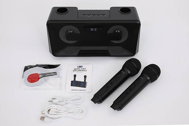 구성품으로는 비즈 블루투스노래방 BZ-K1010C 본체와 두 대의 마이크, 충전용 USB 케이블, AUX 케이블, 사용 설명서, 그리고 마이크 커버가 제공된다.
