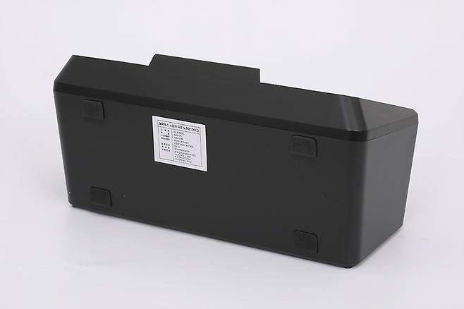 본체 바닥 면에는 가운데 부분에 모델명과 인증 정보 등이 인쇄되어 있는 스티커가 부착되어 있으며, 가장자리 네 군데에는 미끄럼 방지 고무발도 부착되어 있다.