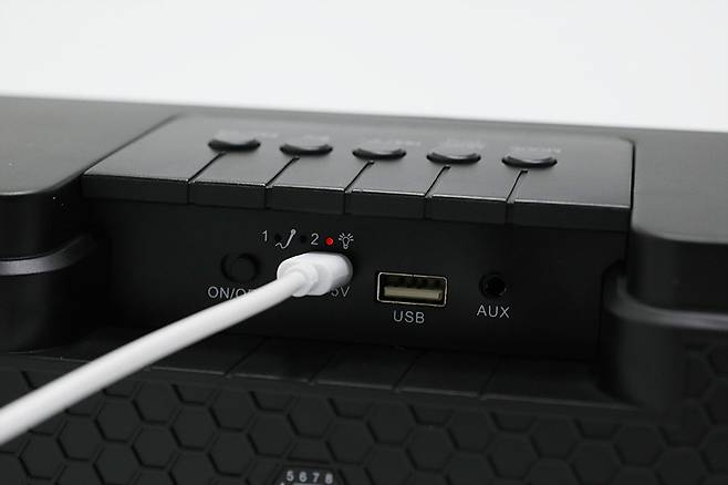 비즈 블루투스노래방 BZ-K1010C의 뒷면에 있는 USB C타입 포트에 케이블을 연결하면 붉은색 LED가 켜지면서 본체가 충전된다. 본체에는 3600mAh의 대용량 배터리가 내장되어 있어서 전원 연결 없이 어디서나 사용할 수 있다.