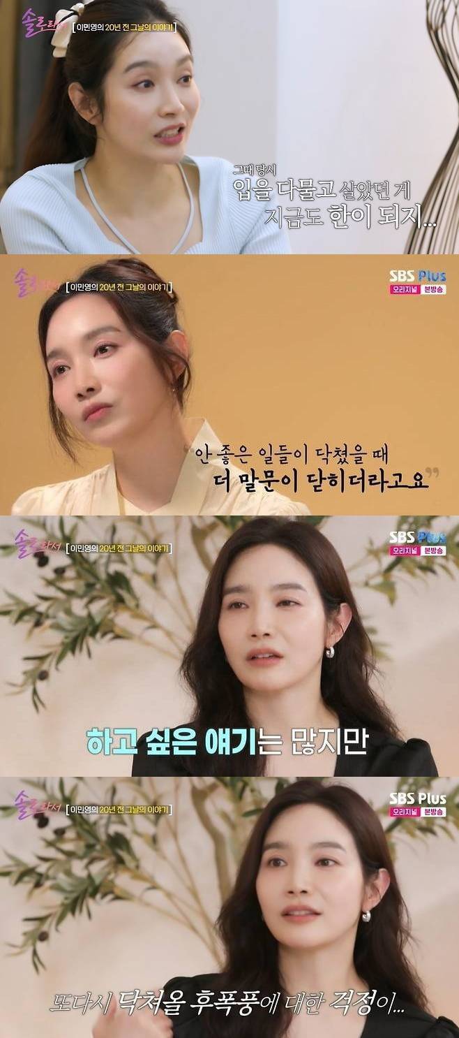 이민영은 “좀 미성숙한 성인이었던 것 같다. 그러다보니 제 일인데 잘 해결하지 못하고 몸도 마음도 아파 어떻게 해야 할지 정리가 잘 되지 않아 내버려둔 것 같다. 표현을 잘해오던 그런 성격이 아니라 그런 일들이 닥쳤을 때 더 말문이 닫히더라. 약간 실어증이 오는 것 같았다. 약간 말더듬이가 되는 것 같고. 한이 될 것 같다”고 했다.