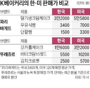 뚜레쥬르도 마찬가지다. 뉴욕의 한 매장에서 파는 모카롤케이크는 25달러(약 3만2000원)로 국내 판매가격 1만6000원의 두 배다. 국내 매장에서 2500원에 팔리는 김치크로켓은 현지에서 4.4달러(약 5700원)에 판매되고 있다.