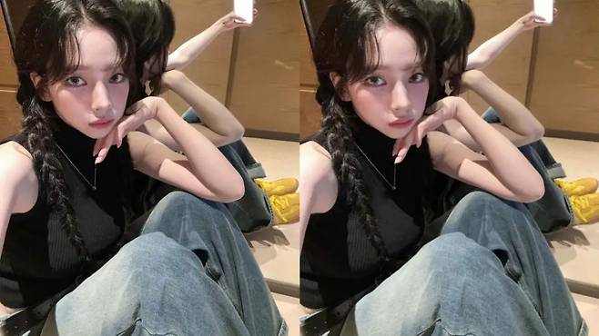 카리나는 평소에도 넓은 통의 데님 팬츠를 활용한 스타일링을 자주 선보이고 있다. 그중 하나가 블랙 민소매 상의와 중청 와이드 데님 팬츠를 매치한 룩이다. 상의는 몸에 딱 붙는 슬림핏으로 상체 실루엣을 정리하고 하의는 넓은 통과 두껍게 접은 밑단으로 반전된 느낌을 줬다.