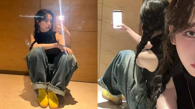 스니커즈는 복고풍 하이탑 디자인으로 브랜드 로고가 들어간 디테일이 스트리트 감성을 강조했다. 헤어스타일도 전체 룩과 자연스럽게 어우러졌다. 양갈래로 땋은 머리는 귀여우면서도 힙한 분위기를 동시에 보여주며 데님과 찰떡같은 조화를 이뤘다.