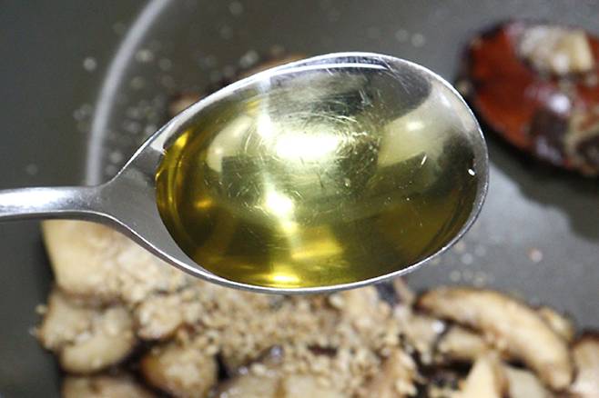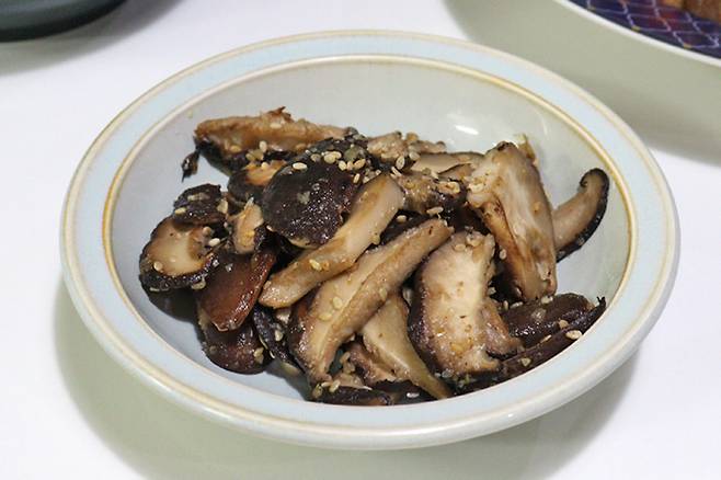 표고버섯이 익으면 불을 끄고 통깨와 참기름 둘러 마무리합니다. 접시에 담아 맛있게 먹습니다.