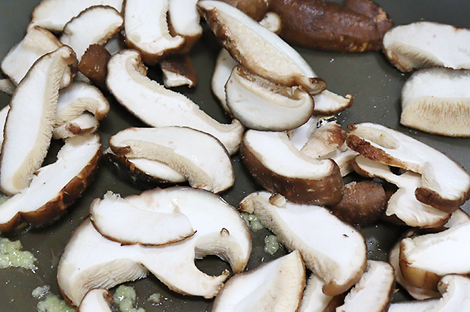 표고버섯을 슬라이스로 썰어주세요. 너무 얇지 않게, 적당히 균일한 두께로 자릅니다.