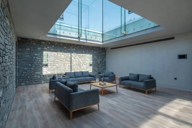 지면 위로 드러나는 것은 투명한 유리 상자 하나뿐이다. 모호하고 신비로운 이 작은 출입구가 집 전체로 이어지는 유일한 시작점이다. 지붕과 천장, 조경이 하나로 합쳐져 건물의 윗면이 그대로 자연 풍경의 일부가 된다.