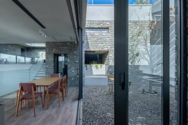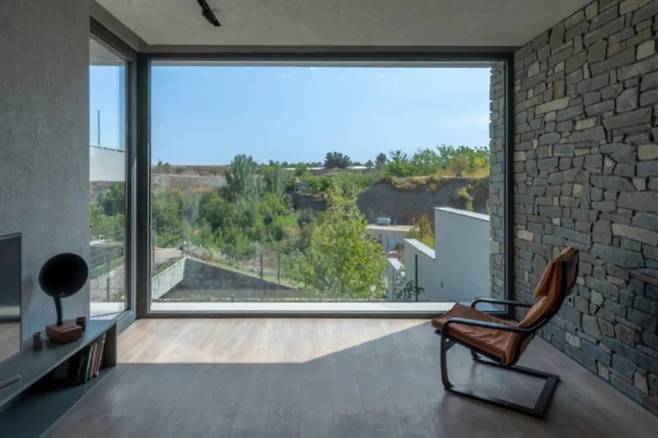 계절마다 물이 흐르는 강 옆, 가파른 경사지 위에 지하 1층과 지상 2층으로 완성된 이 집은 보이는 것보다 훨씬 많은 것을 품고 있다.
