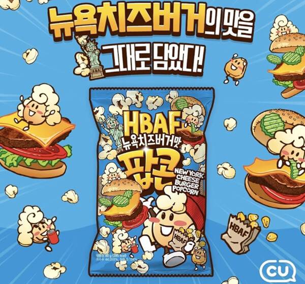 편의점 CU는 버거의 원조로 꼽히는 뉴욕치즈버거를 과자로 만날 수 있는 ‘바프 뉴욕치즈버거맛 팝콘’을 출시했다. 견과류 기업인 바프와 손을 잡고 출시한 팝콘으로, 신기하게도 정말로 팝콘에서 햄버거의 향기를 맡을 수 있는 제품이다. 팝콘에 골고루 뉴욕치즈버거 시즈닝이 묻어 특이한 풍미를 즐길 수 있으며, 팝콘 특유의 바삭함도 잘 살린 과자라 할 수 있다. 본 제품의 편의점 기준 판매가는 1,700원이다.