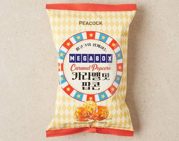 피코크는 멀티플렉스 메가박스와 협업해, 대형마트 등지에서 먹을 수 있는 팝콘 신제품을 출시했다. ‘메가박스 카라멜맛 팝콘’이 바로 그것이다. 영화관에서 먹던 바삭바삭한 식감을 그대로 담고, 진한 캐러멜의 풍미도 놓치지 않은 팝콘이다. 메가박스 영화관에서 만날 수 있는 더블 카라멜 팝콘을 봉지과자로 옮긴 제품이라 할 수 있다. 140g 용량의 봉지과자로 판매되며, 대형마트 기준 판매가는 2,580원이다.