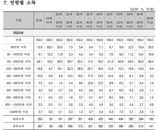 연령대별로는 어떨까. 통계청이 2월 발표한 ‘2022년 임금근로일자리 소득(보수) 결과’를 보면, 30~35세 미만 월 평균소득은 351만원, 중위소득은 315만원이다. 중위소득은 소득 데이터를 나열했을 때 정확히 한가운데에 있는 수치를 말한다. 30대 초반 직장인이 315만원을 받으면 중간에 해당한다는 얘기다.
