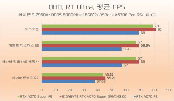먼저 RTX 4070의 타겟 해상도인 QHD에서의 결과를 정리했다. 게임마다 다르지만 일반적인 래스터 기반 게임 환경과 레이 트레이싱 게임 환경 모두 최대 4프레임가까이 높은 성능을 기대할 수 있다.