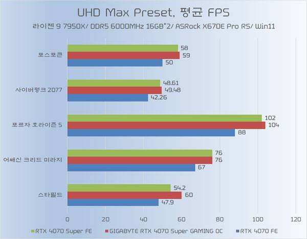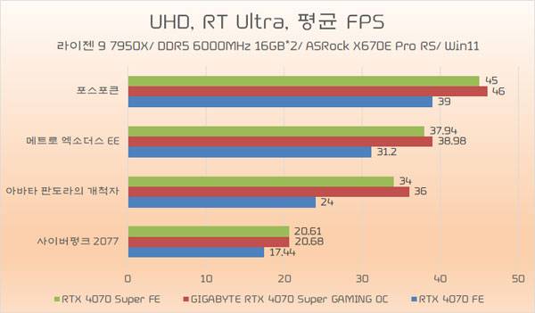 다음으로는 그보다 높은 UHD 해상도에서의 테스트 결과도, 레스터 환경과 레이 트레이싱 환경 모두 기가바이트 지포스 RTX 4070 Super Gaming OC 제이씨현 그래픽 카드의 성능이 더 뛰어난 것으로 증명되었다.